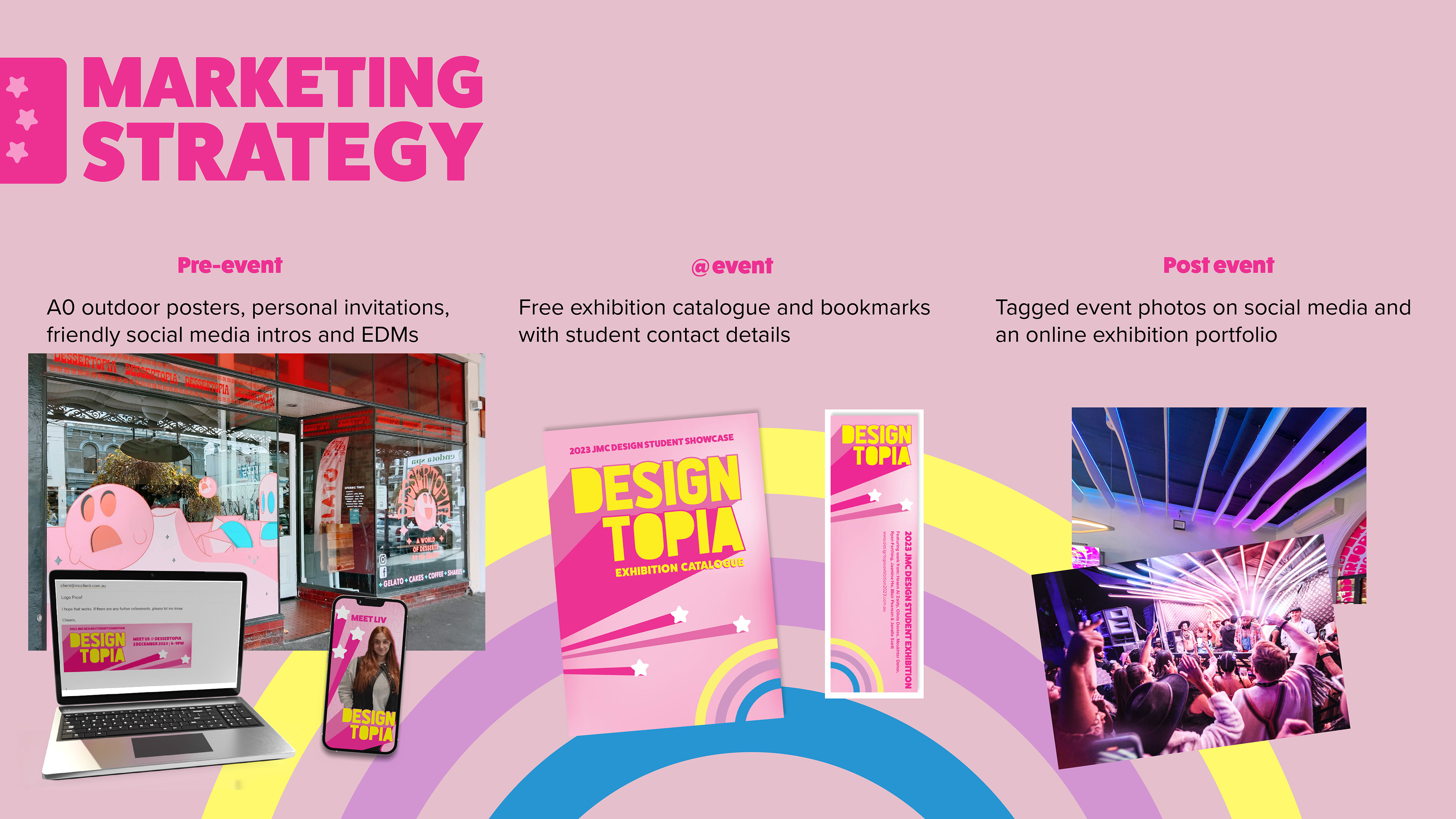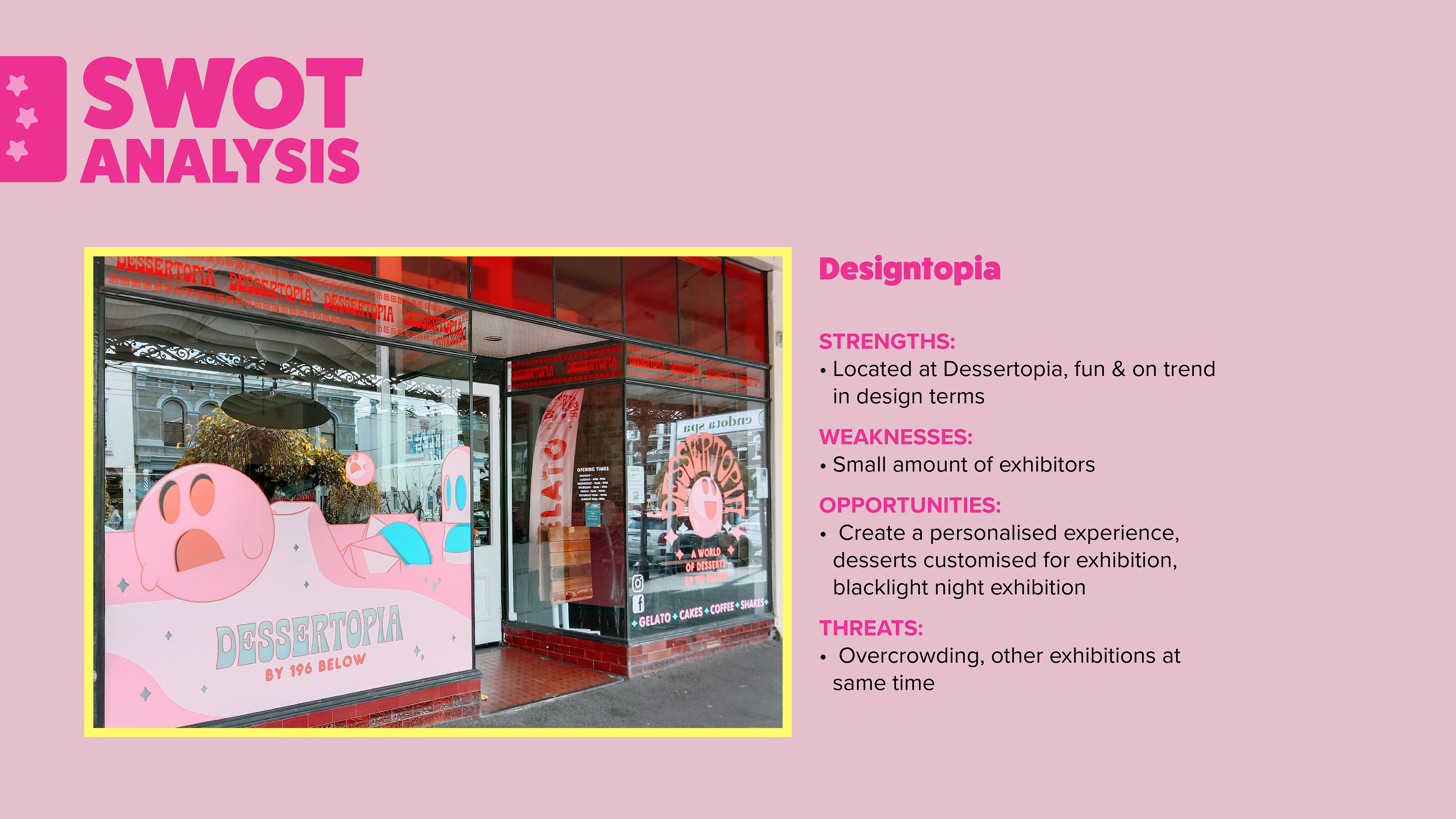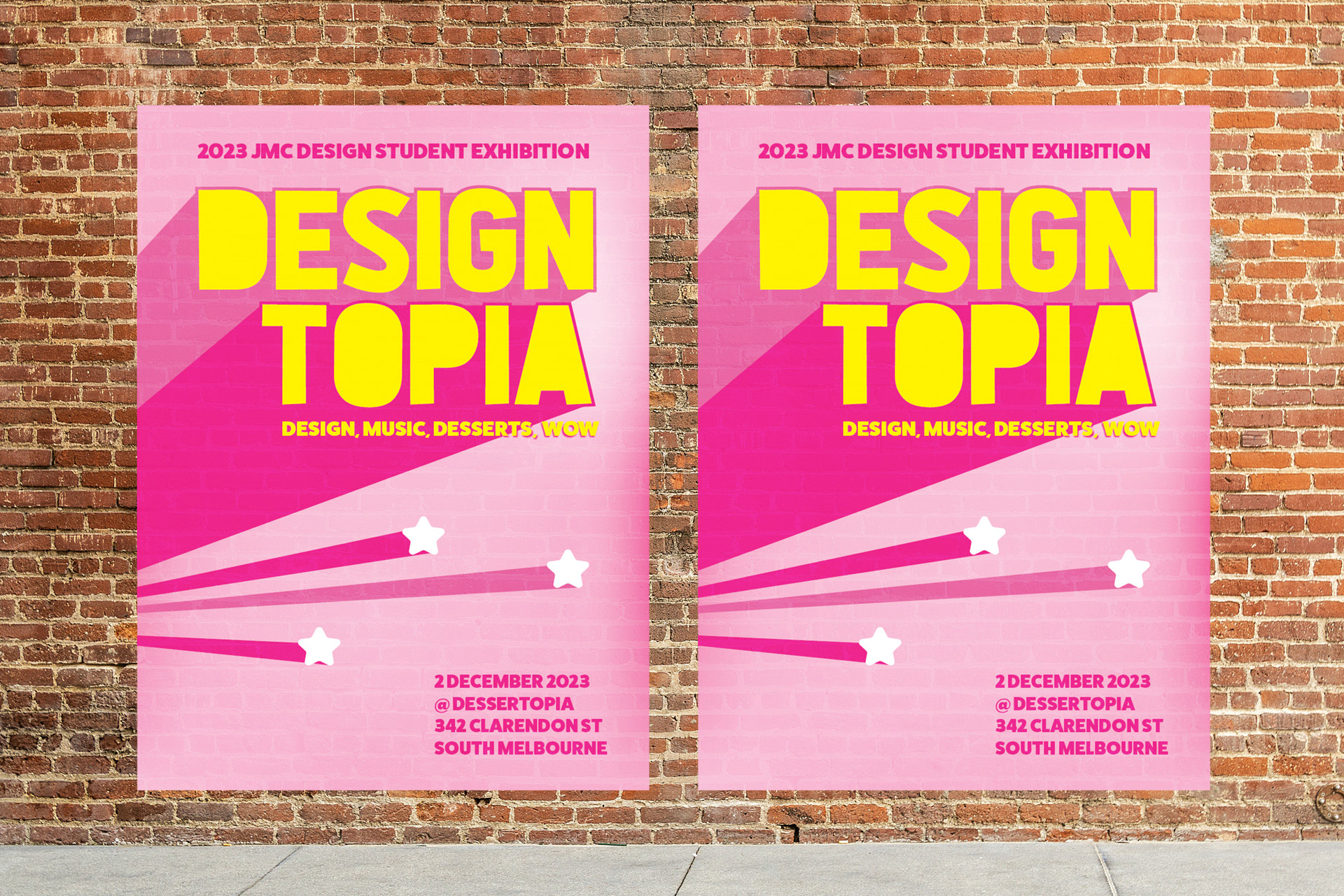 We were briefed with creating a branding and marketing pitch for the graduate student exhibition at Dessertopia. After brainstorming as a group, and completing group or independent market research, I based the theme after the Barbie Movie branding. The heavy dropshadows were iconic in 2023. This pitch won and the brand was further developed for the exhibition and promotions by our senior lecturer and our other design students then also used by the Sydney cohort.