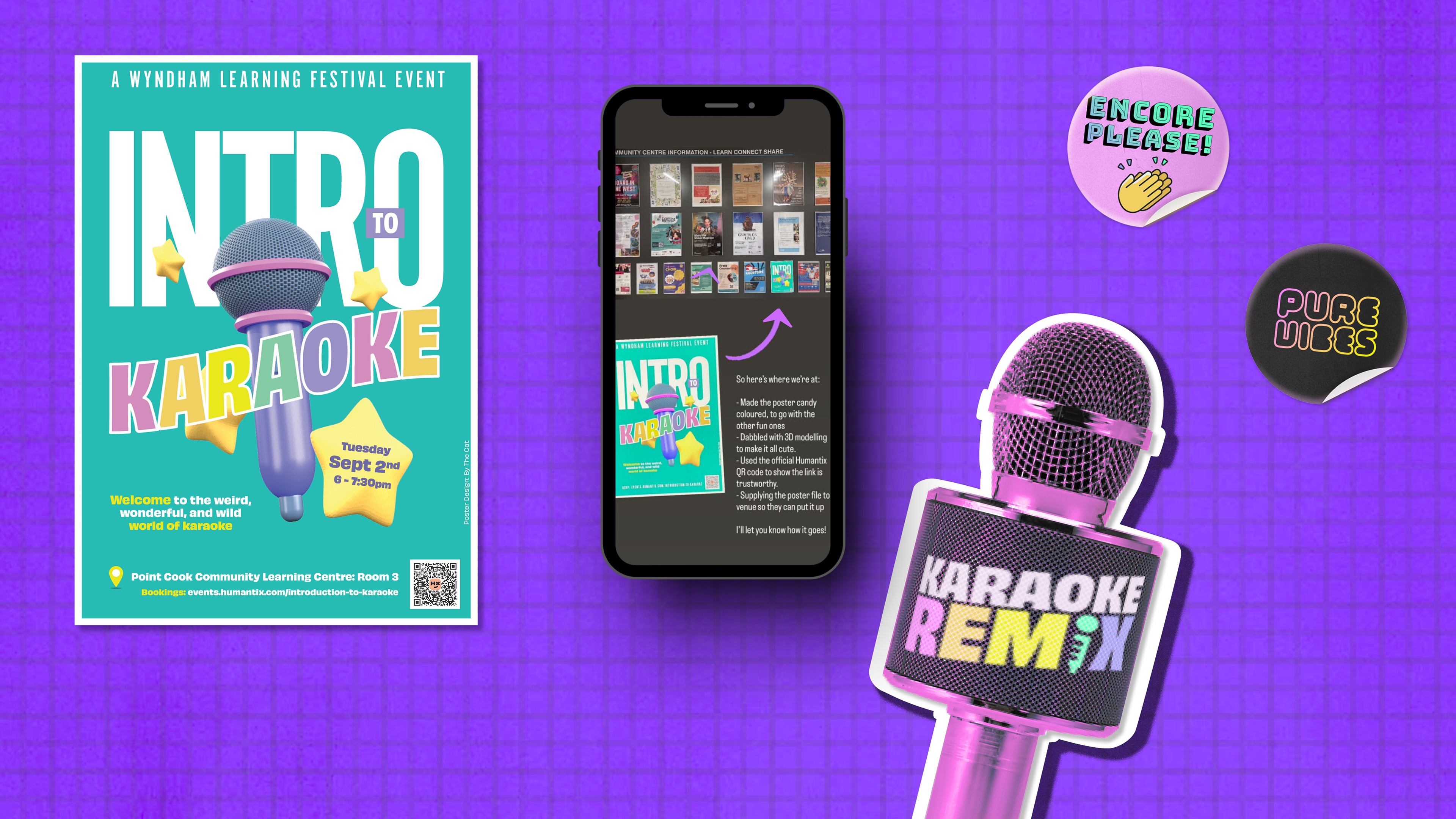 This truly is karaoke for everybody. Not everyone wants to sing - especially by themselves, under the spotlight and the on stage. So we surveyed everyone we talked with and reimagined karaoke events, so that they could be better for everyone. And then we took it out into the world - at uni, then at the Wyndham Learning Festival - to showcase the bright new direction where we are taking karaoke. From print design, to digital, in Figma and Wordpress, 3D modelling to handcrafted props, this business is packed and ready to go. Looking forward to our next adventure!